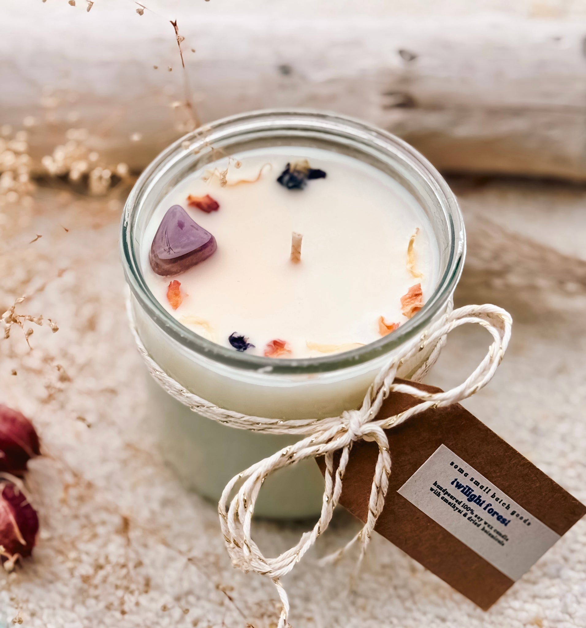 Ingredients: Natural Soy Wax, Fragrance Oil, Pure Essential Oil, Dried Botanicals, Real Crystal Stone